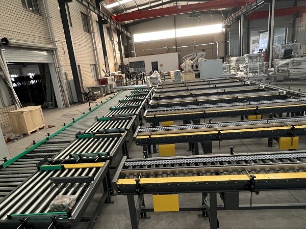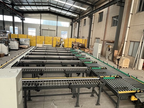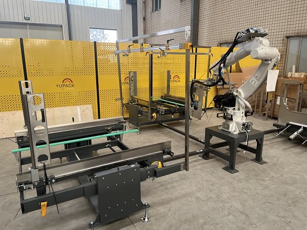 該線體主要功能是對卡丁車和賽車輪胎進(jìn)行裝箱和碼垛。線體最大亮點(diǎn)是,客戶一共有8條產(chǎn)線4種紙箱尺寸同時混產(chǎn),針對客戶的現(xiàn)實(shí)情況,艾訊采用了機(jī)器人+動力料倉+自適應(yīng)折底封底機(jī)的結(jié)構(gòu),通過信號交互,來確定取哪款紙箱,開哪款紙箱,再通過信號識別,將紙箱輸送到指定的裝箱工位。同時該線體還配備了實(shí)時貼標(biāo)加在線打印功能,通過和上位機(jī)的實(shí)時通訊,來確定紙箱需要打印的標(biāo)簽內(nèi)容。