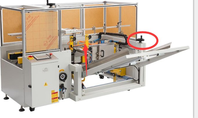 2、無(wú)法正常折箱。開箱機(jī)不能折底時(shí),機(jī)器會(huì)報(bào)兩種錯(cuò)誤,折前蓋超時(shí)或者折后蓋超時(shí),一般出現(xiàn)這樣的情況如果排除了紙箱太厚 太硬沒(méi)有折上去的情況下,多半是因?yàn)榱蟼}(cāng)調(diào)節(jié)的不夠高,導(dǎo)致這前蓋和折后蓋的氣缸并沒(méi)有接觸到前蓋和后蓋,因此會(huì)報(bào)錯(cuò),用戶只需要調(diào)節(jié)這個(gè)手柄,將料倉(cāng)的高度向上抬高一點(diǎn)即可。